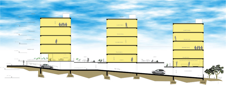 Por la topografía del terreno, se opto por respetar la pendiente y así evitar costes por nivelación y movimiento de tierras. Los bloques de departamentos se encuentran en distinto nivel, de esta manera se mejoran las vistas y el asoleamiento de los mismos.